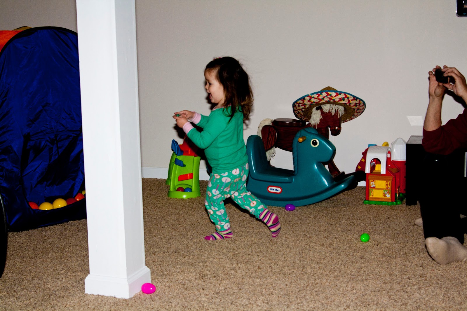 So that wonderful husband of mind spent all Saturday night ripping up the carpet and loading it into the garage. The day was spent moving 1300 square feet of toys, toys, and more toys into every nook and cranny of our house, sunroom, and garage. Teagan napped, Parker was tossed in the Ergo, and we went to town moving, cleaning, and trying our best to appear on the latest season of Hoarders. Mission accomplished on all fronts.